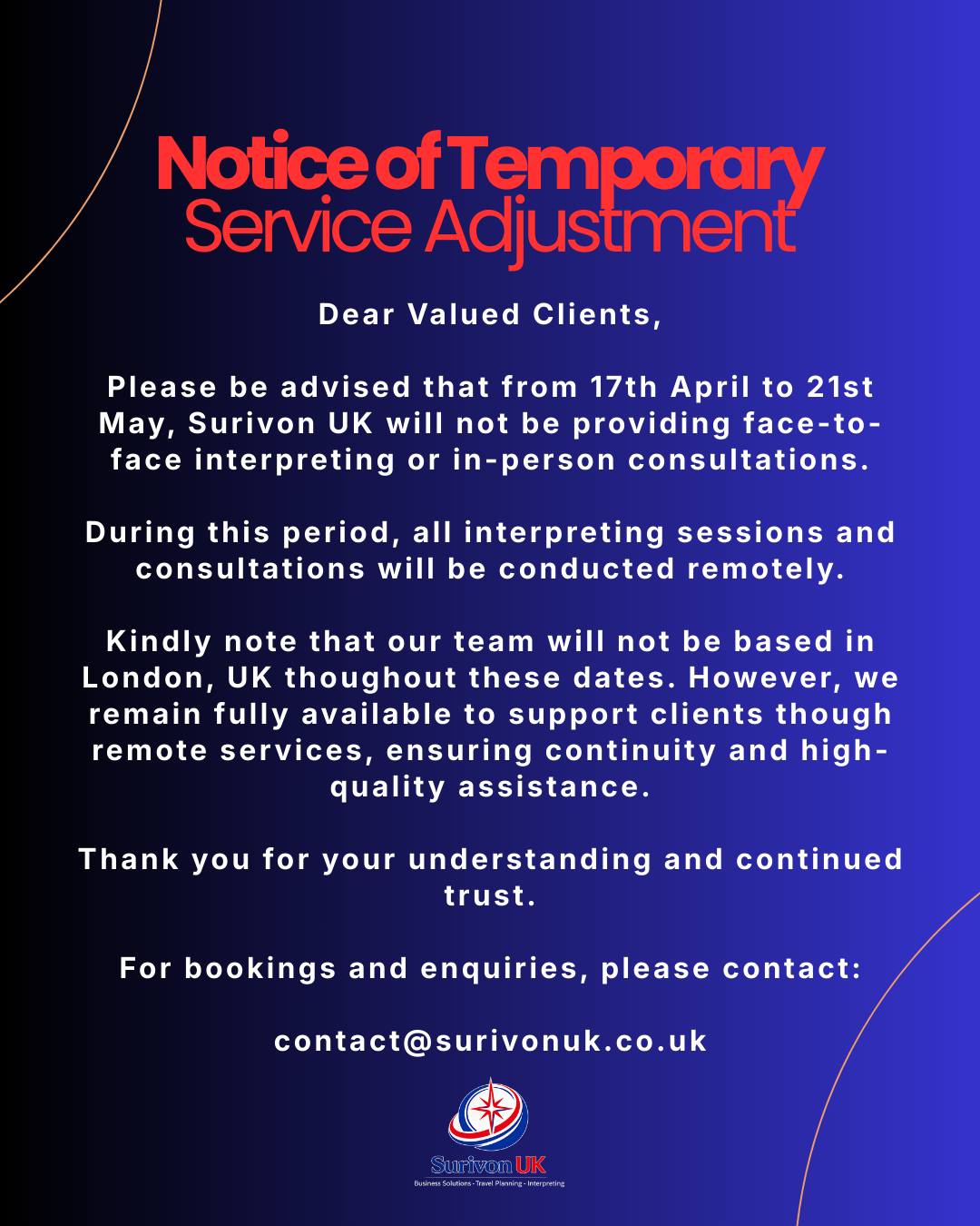 At Surivon UK, our team combines expertise in business solutions, travel planning, and professional interpretation to deliver reliable and tailored services for clients in the United Kingdom and internationally.